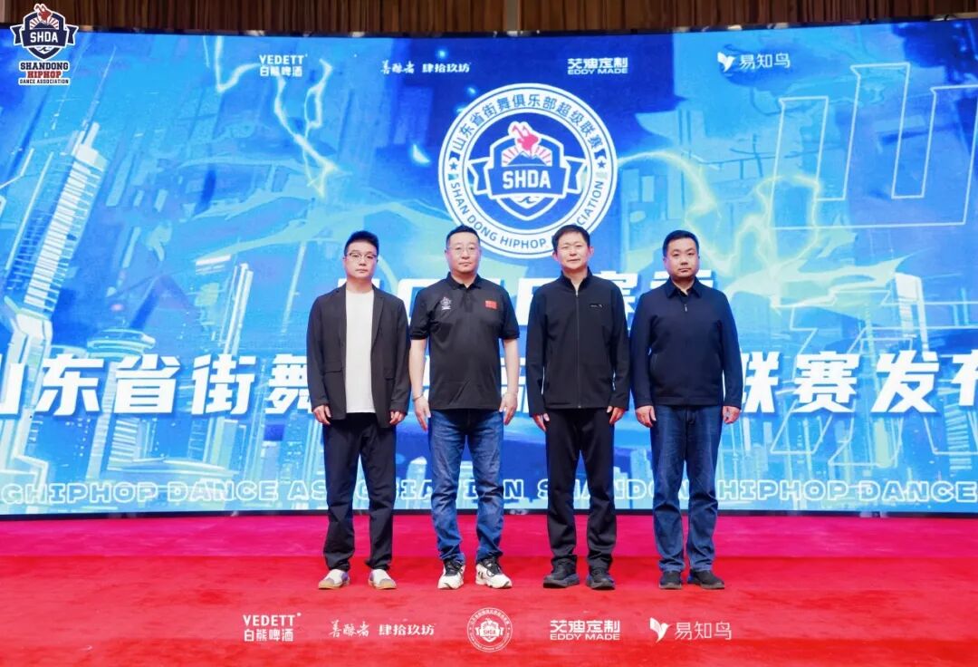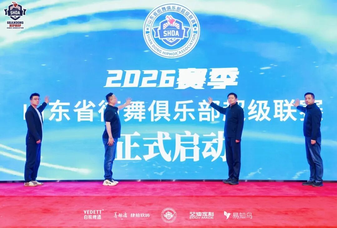 日照市体育局党组副书记、二级调研员葛新,山东省街舞协会会长徐化楠,山东省街舞协会副会长郭佳,日照市东港区教体局党组成员、区体育事业综合服务中心主任王海雷,共同上台启动2026赛季山东省街舞俱乐部超级联赛。